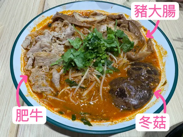 而我老公嗰碗就係中辣,有豬大腸、冬菇、肥牛。每碗米線都有好多配料、肉碎🤩