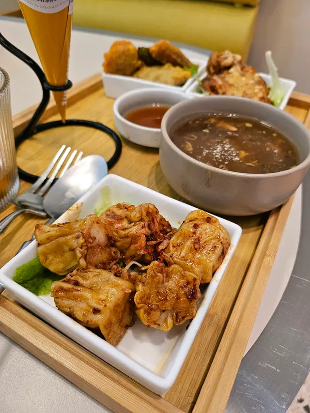 #麥皮蝦芒果沙律脆筒 、#碗仔翅蒟蒻麵 、#特特大魚蛋 、#山椒鹹蛋黃雞翼 、#蝦頭油菜圃燒賣 、#新煎釀三寶 ,一上枱睇見成個拼盤都流曬口水!