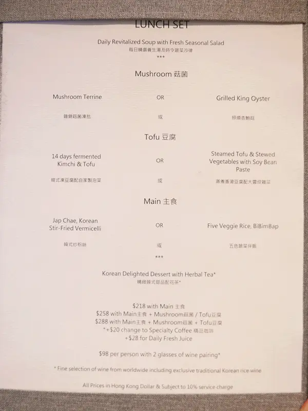 精緻健怡的午市套餐 $218備有一款主菜丶精選湯品丶時令沙律及甜點,$258 就可選擇配多一款精選豆腐或菇菌菜式,$288則可選同時配備精選豆腐及菇菌菜式。