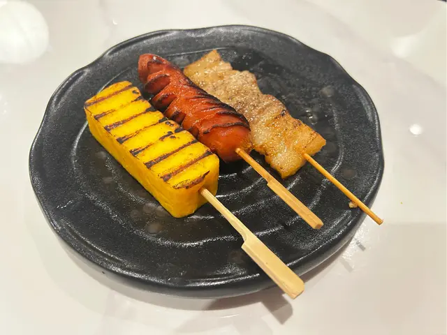 串燒部分也相當出色,有宮崎豚肉、日本黑豚肉腸和燒玉子串。宮崎豚肉的肉質鮮嫩,燒烤的香味撲鼻而來,讓人忍不住想一口接一口。日本黑豚肉腸則口感豐富,油脂適中,讓人滿足。燒玉子串的滑嫩和微甜更是為整個串燒增添了一絲柔和感,讓人心情愉悅