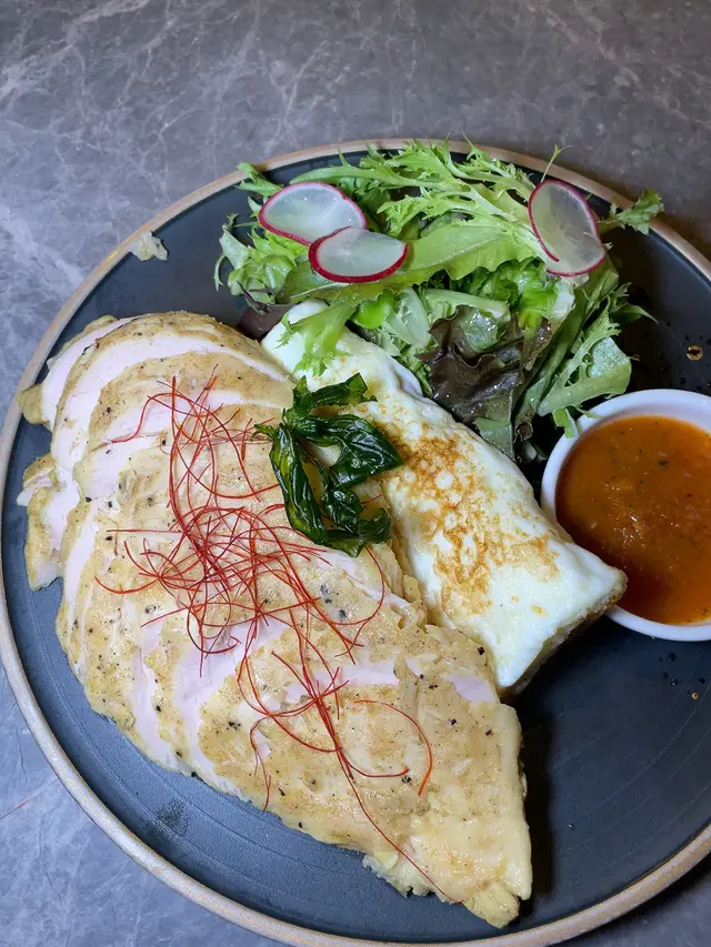 慢煮雞胸超大塊,食落唔乾,而且配泰式辣醬都幾夾, 蛋白卷則似平時煎燶邊太陽蛋嘅文果走蛋黃,淡淡胡椒調味