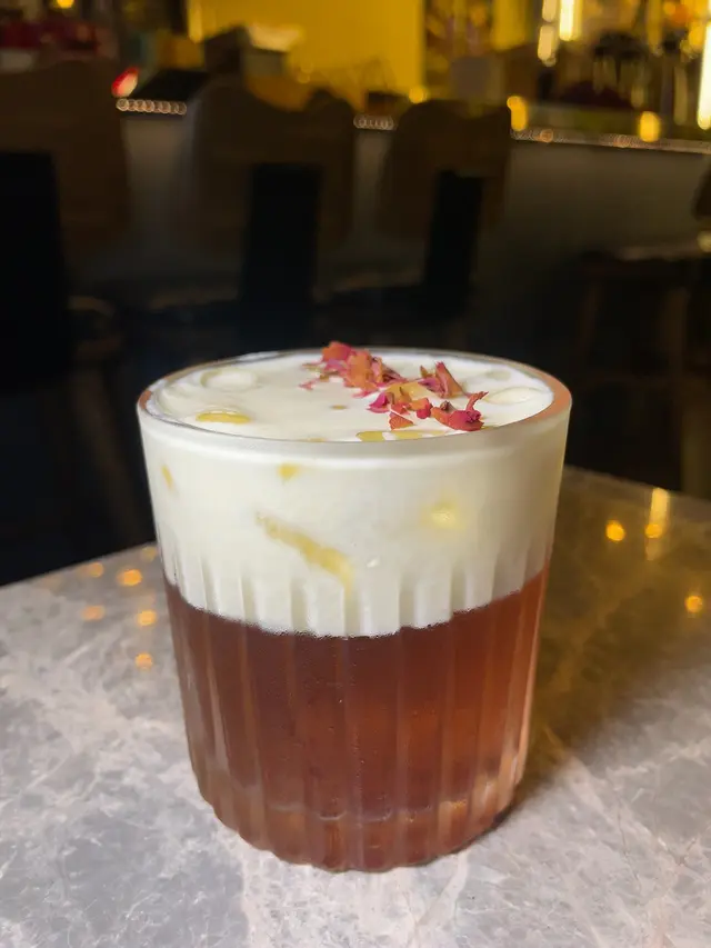 頂層芝士奶蓋有玫瑰花瓣作裝飾,配上有汽桃果汁,桃味香溢,味道層次豐富。