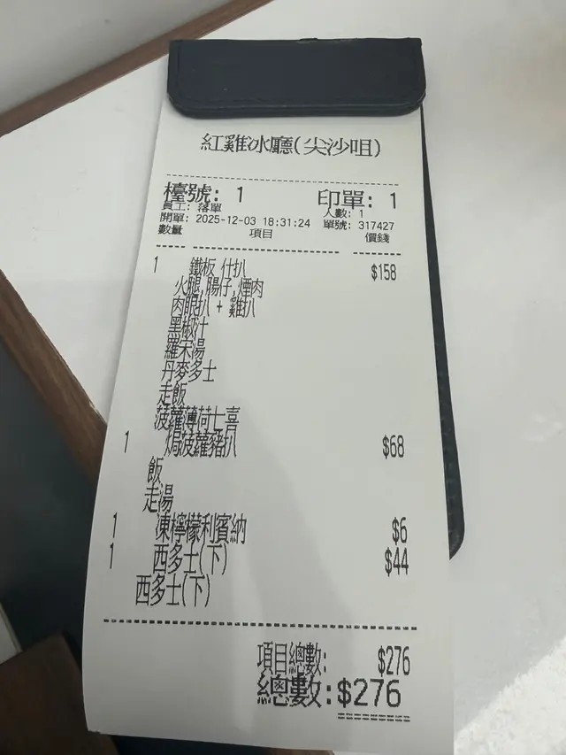 港式情懷 價錢相宜 rosie1118等级42025-12-04 Follow 今日係尖沙咀食港式茶餐廳,係N出口出好快到! 入面裝修夠曬香港情懷!黎到見到有經典既扒餐,叫左個什扒餐,有肉眼扒, 雞扒 ,火腿 ,腸仔 ,煙肉,夠曬豐富。今日簡左配黑椒汁同羅宋湯。羅宋湯好足料,湯頭有蔬菜既清甜! 雞扒煎得外皮酥脆,內裡多汁。牛扒配埋濃郁既黑椒汁好好食。薯角帶少少焦香,好香口。焗菠蘿豬扒飯有炒飯底係基本,鐘意佢既豬扒唔會太多筋,好易咬。菠蘿大大粒,好足料! 西多士都係必食,外酥內軟,中間夾住花生醬,香甜濃郁,糖漿因應個人喜好自己落。呢到既特飲款式都幾多,檸檬利賓納真係好耐冇飲過啦,好清爽! 菠蘿薄荷七喜呢杯都好正,好解渴!The above review is the personal opinion of a user which does not represent OpenRice's point of view.LikeShare港式情懷 價錢相宜 紅雞冰廳 (富峰行) https://s.openrice.com/QrLT0PtHV00Report Post Ratings5Taste5Decor5Service5Hygiene5ValueDining Method堂食