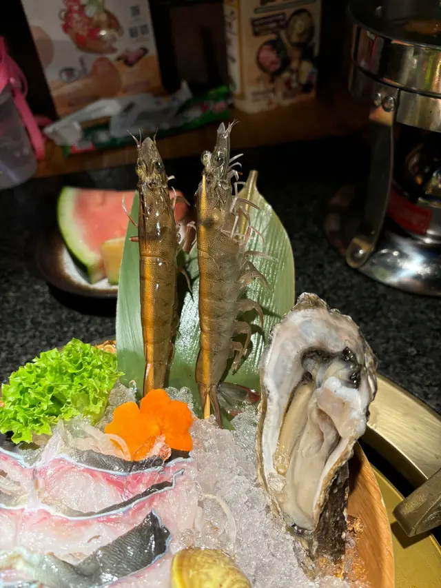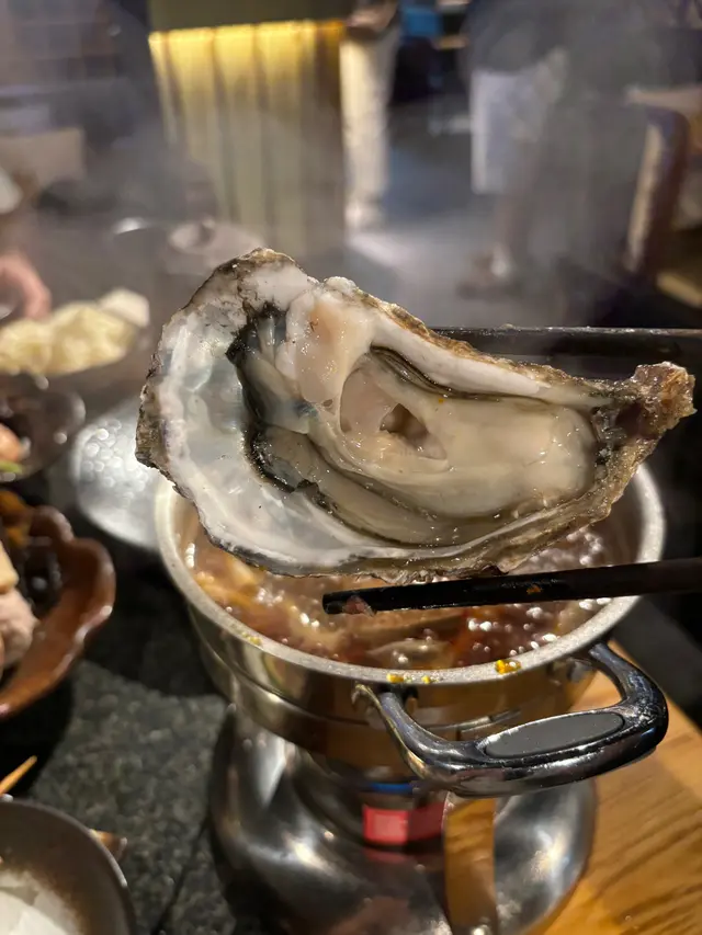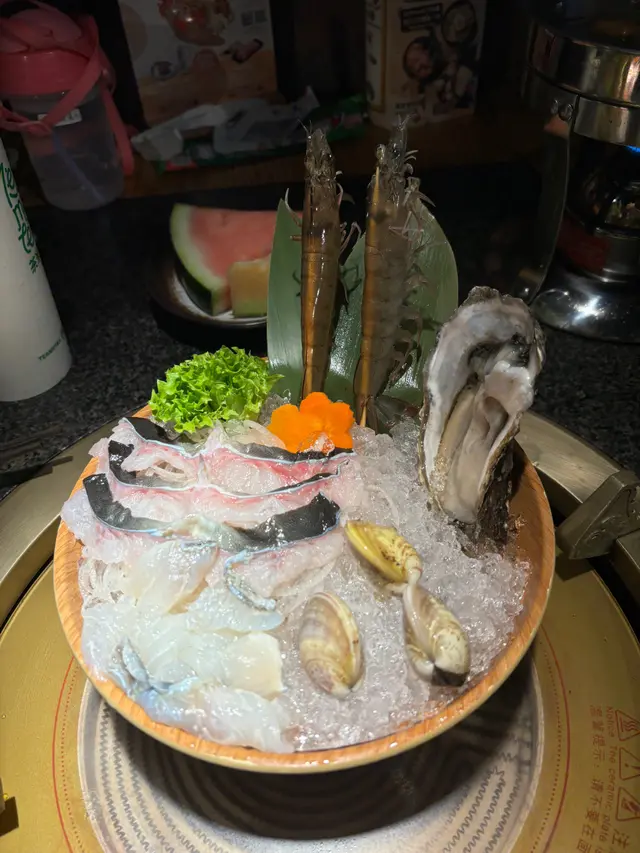 小火鍋海鮮拼盤,份量都唔少有兩隻色郁嘅超新鮮蝦,一隻勁大嘅生蠔同埋有蜆及魚肉