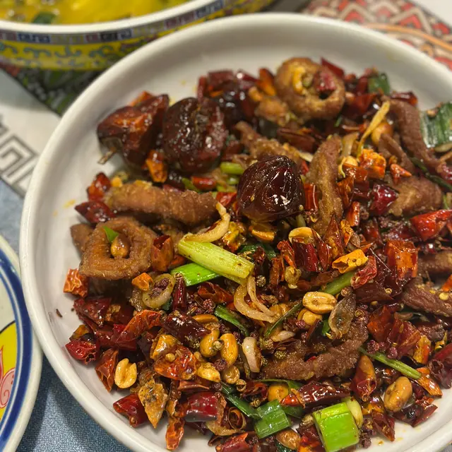 哩碟干煽肥腸用上乾椒、花椒、洋蔥,蔥粒及紅椒等炒香肥腸,所以辣味都好多層次不死辣,帶有花椒麻香之餘,辛辣又令人食得好過癮。