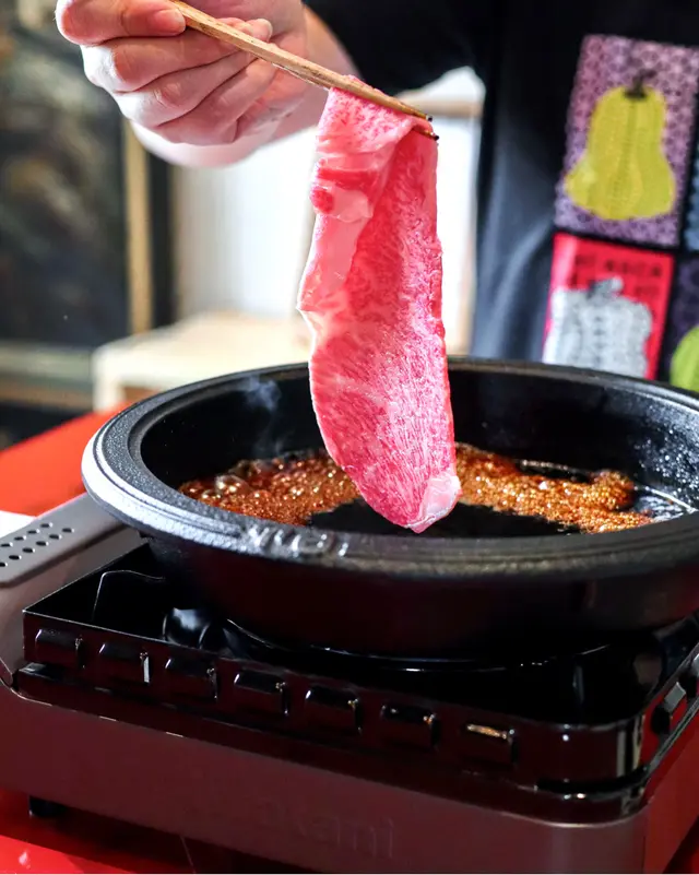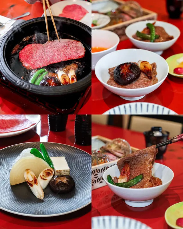 席前即席烹調壽喜燒✨ 揀選了西冷部位,油花分佈均勻,肉質柔嫩多汁且重油脂香👅 和牛吸收醬汁嘅香甜,搭配豆腐、冬菇等蔬菜,濃郁入味,令整體味道更豐富🥰