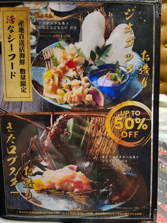 🟩發現餐廳都做緊限時半價優惠,產地直送活海產如活伊勢龍蝦刺身做緊$668➛$398、北海道活白象拔蚌刺身$680➛$338、 連啤酒類都做緊半價割引。