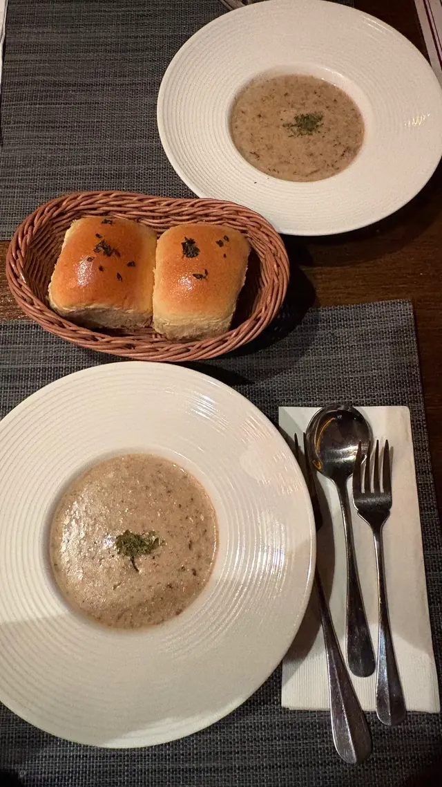 個 set 包沙律、餐包同湯;沙律菜好新鮮,羅馬生菜脆卜卜,食落去仲有菜本身嘅甜味;蘑菇湯令我驚喜,真係足料,飲落去有啖啖既菇,又夠濃郁,好味。