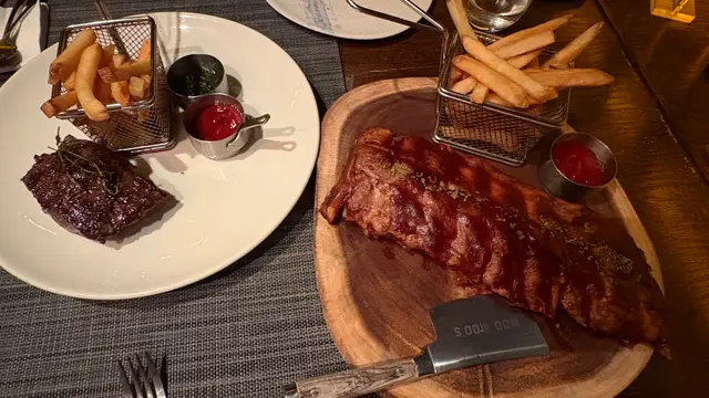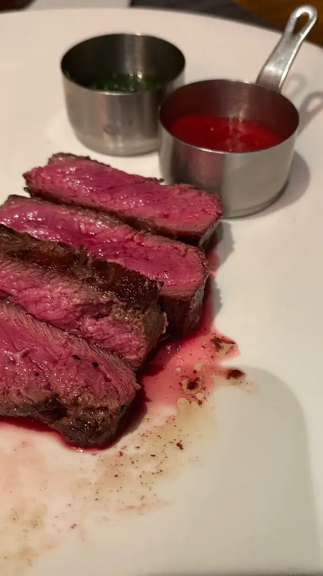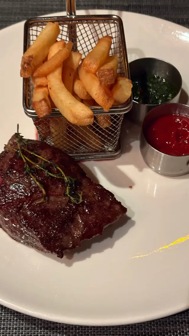 本來我地想加錢食安格斯牛扒,但店員了解左我同朋友既生熟喜好之後,就倒轉介紹佢地既平鐵牛扒,唔洗加錢TIM,食落似牛柳🍽️。上到枱時,我認為牛扒煎得剛剛好,切開入面係粉紅色(雖然我朋友鍾意食熟啲,但佢可以食頭尾兩側既肉,果啲煎得熟,佢啱食),但中間唔會過熟,肉質仲保持住嫩滑多汁,配埋佢自家特製嘅醬汁,幾夾幾香。佢既餐刀好得意,係一把迷你既肉刀。
