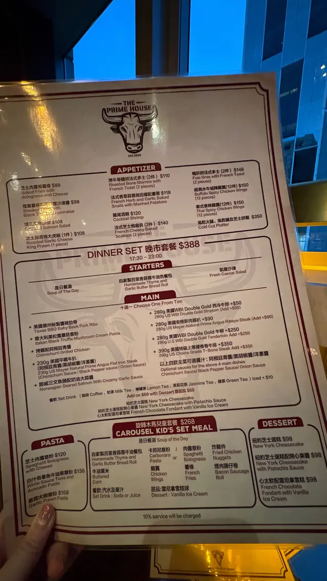 一坐低,店員都好有禮貌咁招呼我哋,感覺唔錯。餐牌主打牛扒配粗薯條,款式選擇有SET MENU同散叫小食,最後我地叫左兩個set dinner。