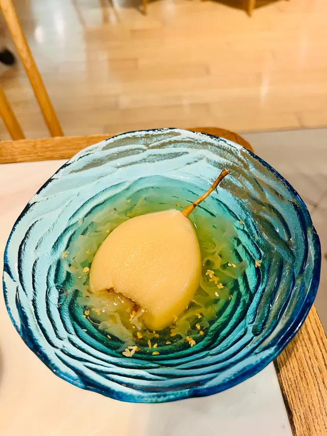 燉品清潤甘甜,陳皮香與桂花幽雅,雪梨軟嫩透光,飯後潤喉一流。