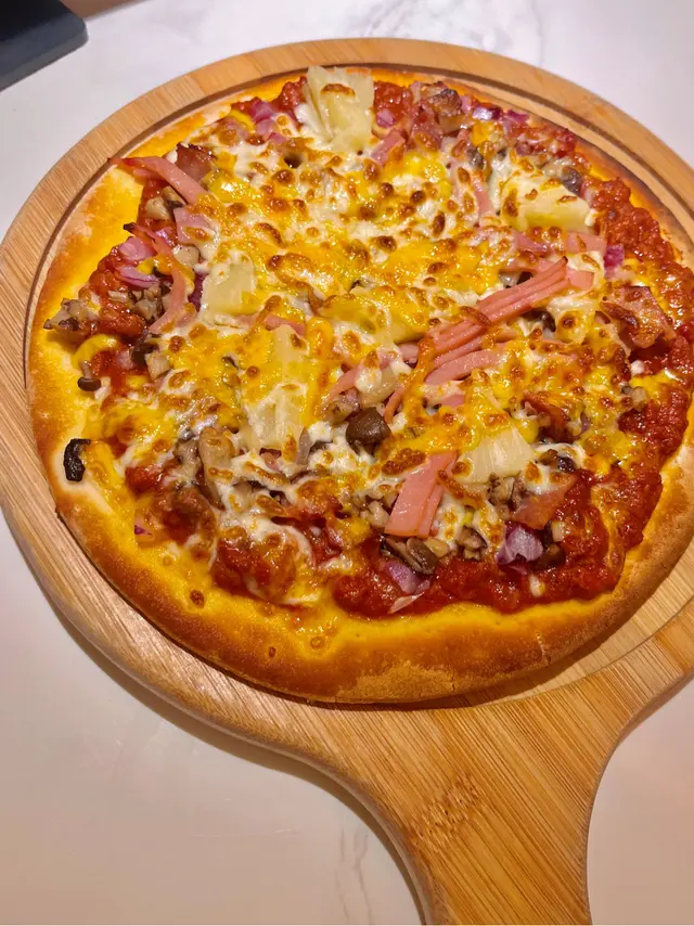烤牛肉披萨小东西出品的还挺快,🍕虽然看起来不像九寸的,但馅料很足,而厚重的芝士一整个大拉丝🧀,就是吃多了稍微有点咸