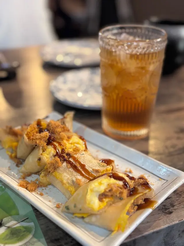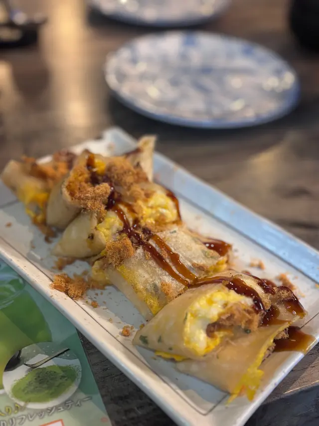 蛋餅皮煎至微酥,內餡肉鬆量足,芝士遇熱半融拉絲,咸甜交織的經典組合本應穩贏,可惜芝士香氣偏淡,未與肉鬆碰撞出濃郁火花,若餅皮再焦脆些更佳。