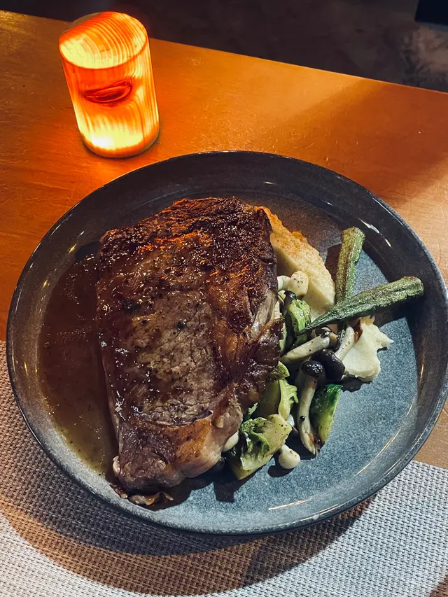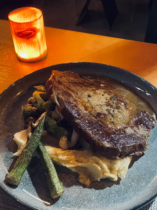 頭大同愛人揀咗黑安格斯肉眼扒五成熟,不過切開似七成熟😂肉質都算嫩口同好大塊,有少部份較肥,配煙燻薯蓉、秋葵,菇🍄椰菜仔,加上黑松露燒汁,燒汁都幾好食,不過煙燻薯蓉就有啲奇怪🤔有啲似中藥味,唔係好夾🤫