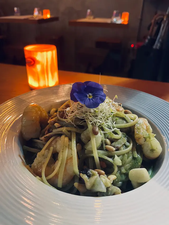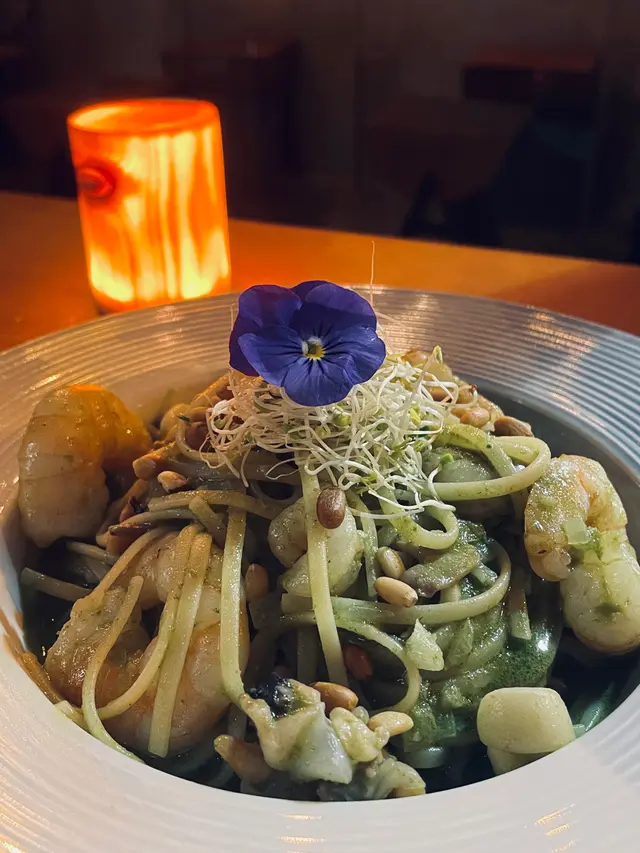 頭大見多人揀依款粉🍝於是試試佢🥴味道又真係幾好食😋羅勒醬帶少少麻辣口味,蝦都彈牙之餘配上葵花籽增加口感😝唔算辣反而帶麻麻既感覺,食唔到辣嘅食貨都可食試試 💚