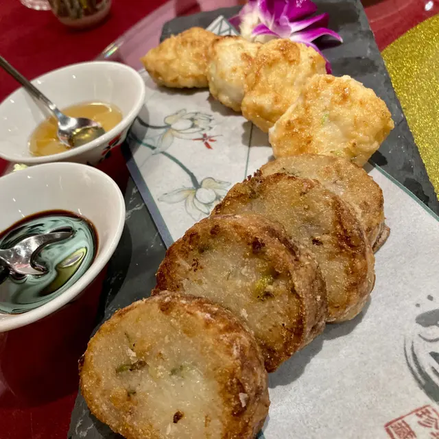 蘿蔔灌漿外酥內軟,內餡好似食緊蘿蔔糕。墨魚餅好彈牙,煎得很香。
