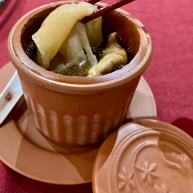 燉湯充滿了滑嫩的花膠、新鮮的野菌和鮮甜的瑤柱,真的好想添多一盅。
