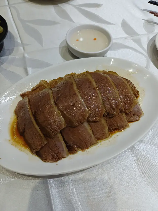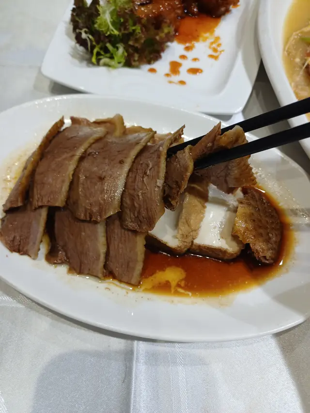 鵝肉看着文理細膩,脂肪不多,上桌前應該淋過一層滷水汁,所以鵝肉色澤明亮,入口不軟不硬,肉質細滑,是我喜歡的口感,第二件鵝肉沾上潮汕獨有的醋,酸酸甜甜,解膩又開胃。底下一層豆腐,滷水跟豆腐絕配,入味又滑溜。