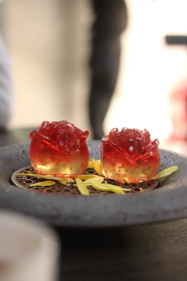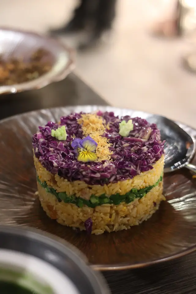 欖菜焗虎蝦的天然鮮味與烘烤香氣交織 。層出不同則是主廚的拿手好戲,炒飯材料豐富,擺盤精美,差點看不出是炒飯。最後以清雅的桂花糕作為餐後甜點
