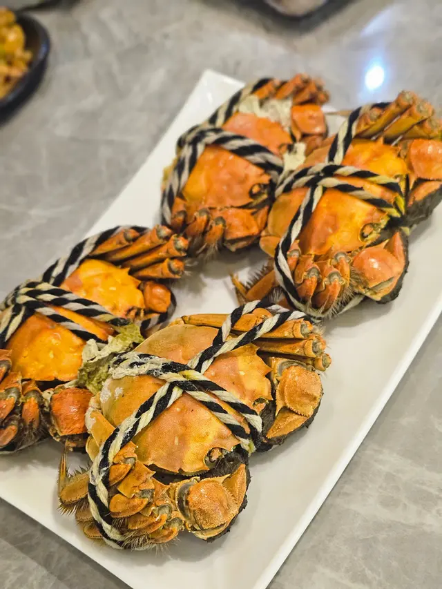 進一步享用的大閘蟹讓我不得不讚嘆!蟹殼金黃誘人,肉質豐滿,一咬下去,蟹肉的鮮美湯汁立刻在口中綻放,簡直係大海的精華,令人陶醉。加上酱油配醋,味道更上一層樓,隨便配搭都是一派風味!🍽️