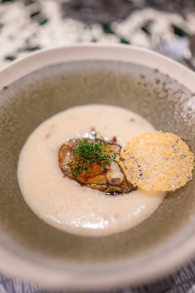 🦪鮑魚粥:用韓國濃稠粥底,加入雞汁煮,好入味!慢煮24小時嘅南非鮑魚超軟淋⏰,面頭塊雞皮脆脆,好似我哋食粥配油炸鬼咁!🍚