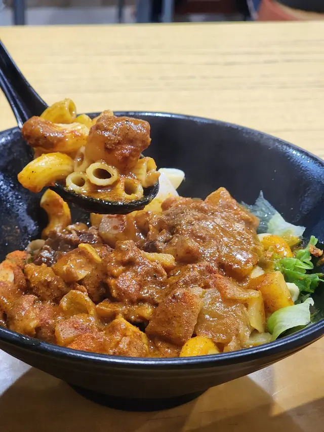 自問也算是能吃辣的人,有次想回味「雄記」的咖喱,於是叫來中辣的咖喱牛腩通粉過過癮,事前經過老闆再三勸喻,最後出來的製成品是將辣度調低至中辣與小辣之間!結果,吃下多年沒吃令我頭冒汗、唇紅腫、心燃燒,需要分三次才能勉強完成的辣勁度,特別是深深吸收了辣汁的生菜。故奉勸各位,千萬不要亂試「雄記」的中辣咖喱!