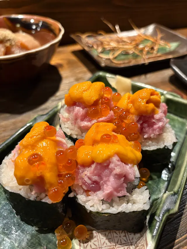 海鮮卷上滿佈海膽及吞拿魚蓉,海膽鮮甜,仲有粒粒魚子更有口感