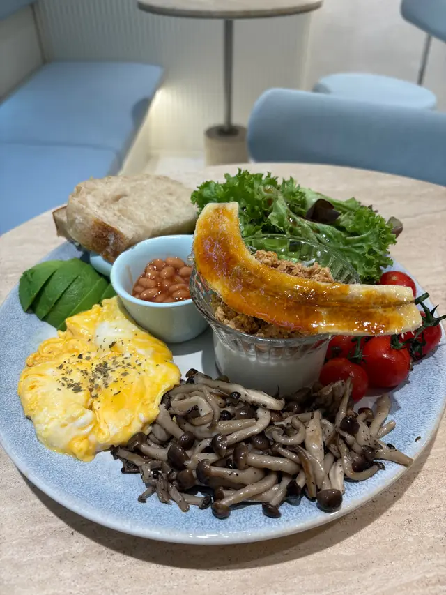 以蔬菜為主,搭配車厘茄、炒蘑菇、牛油果、焦糖香蕉、燕麥、少許蜂蜜的迷你水果酸奶。配有迷你酸種貝果或酸種麵包