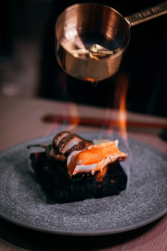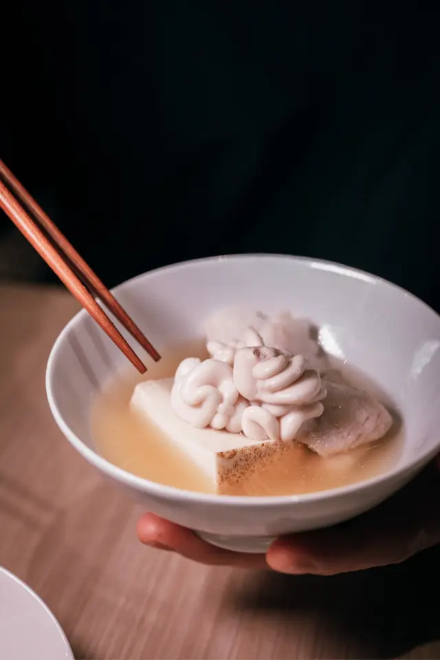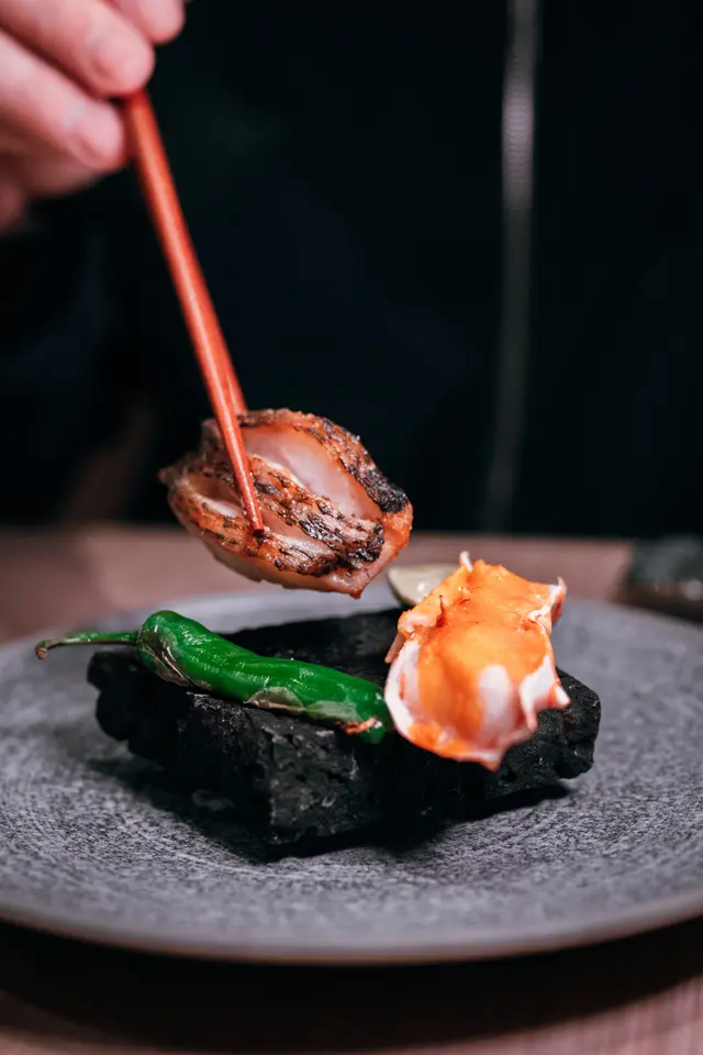 鍋物是寒鱈鍋。鱈魚肉質嫩滑雪白,湯底清鮮,加了少量柚子絲,喝下去有一陣清香,中和了前面的濃味。燒物利用天然石材熱力石燒時令海產。海鮮熟度剛好,帶有一點焦香,保留了原汁原味。