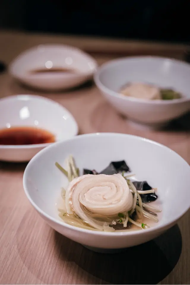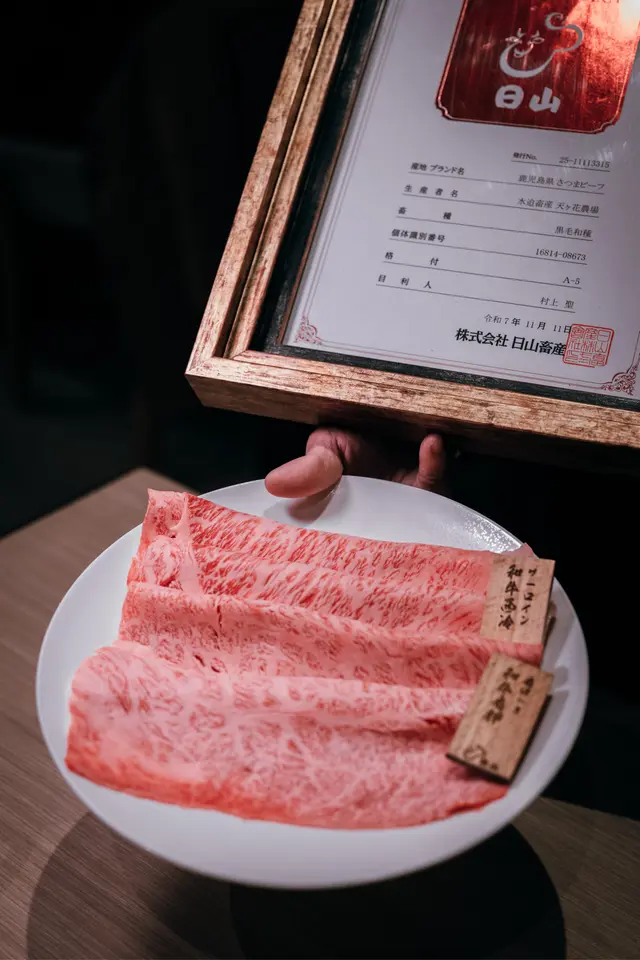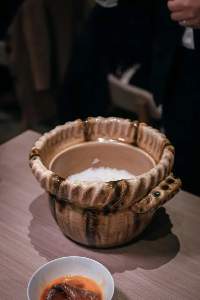 主菜當然是招牌壽喜燒。包含A5和牛西冷及肩胛各一片,醬汁據說是昭和年代流傳下來的秘方,鹹甜適中。西冷油脂極豐富,肩胛肉味較濃,配上野菜五品一同烹煮,剛好平衡了和牛的油膩感。主食可選米飯或稻庭烏冬。筆者選了飯,沾上餘下的壽喜燒汁吃很不錯。