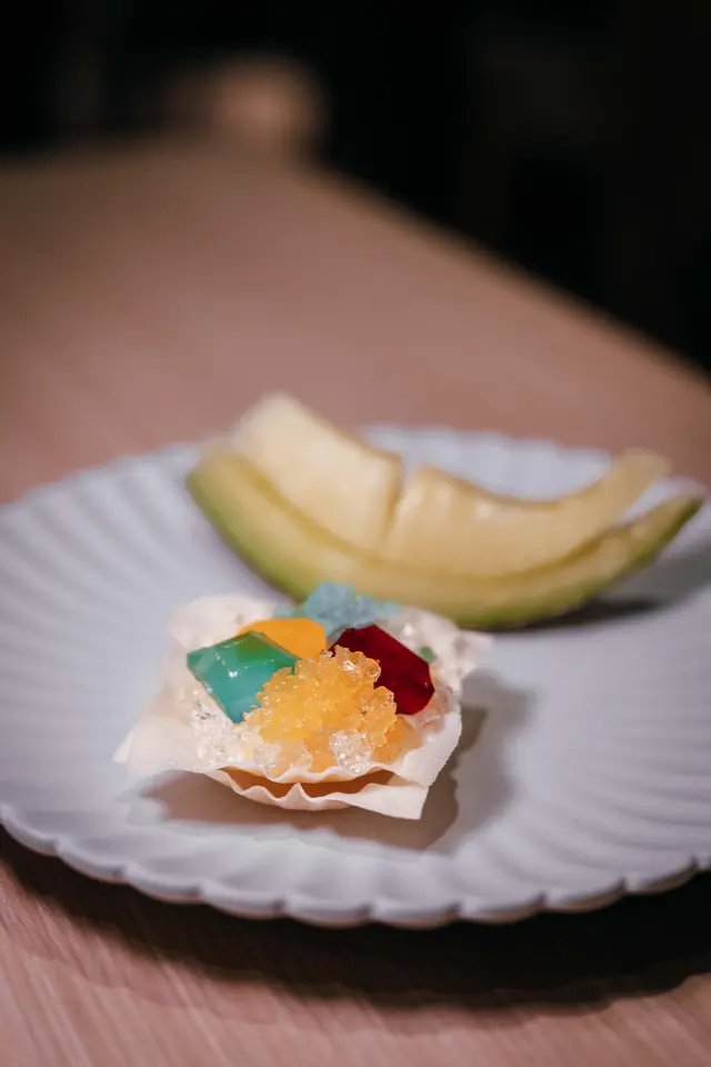 甜品是琥珀糖和柚子撻。琥珀糖外脆內軟,柚子撻酸甜解膩,作為結尾恰到好處。