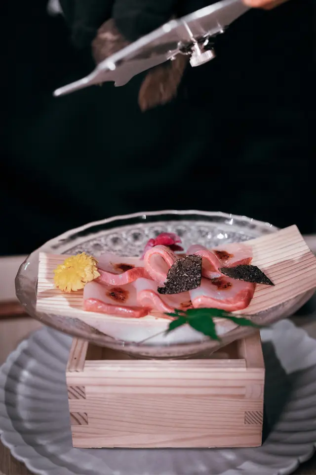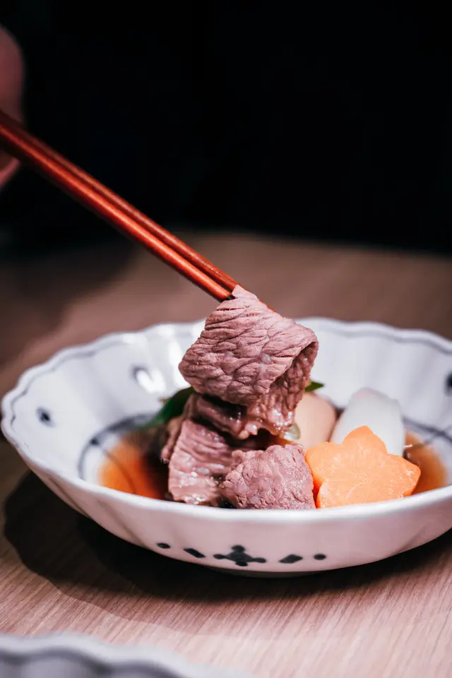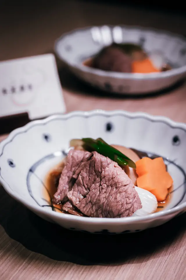 先付是寒鰤薄切刺身配松露。寒鰤正值時令,魚脂分佈平均,入口油潤,松露香氣沒有蓋過魚鮮,配搭得宜。煮物選用A5和牛肩胛肉配合芋頭慢煮。這是參考山形縣的煮法,醬汁屬甘辛口味,濃郁入味,牛肉軟腍,芋頭亦十分綿密。