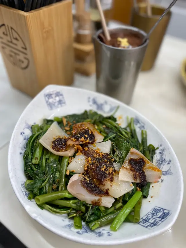 蕹菜即係通菜,份量都算多。水魷爽口彈牙,不會韌~ 水魷上有啲辣醬和炸蒜,辣得黎都幾惹味☺️