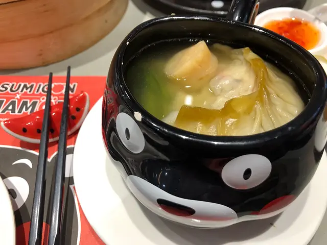 湯盅是以熊本熊盛住,濃濃玩味感,內裡大大隻的灌湯餃,餡料豐富,加上原粒瑤柱,鮮味滲到湯底中。