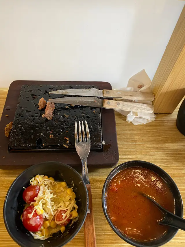 牛扒評價👎🏻:點左一個牛排餐,上黎全部都係筋腱同肥肉位,基本上得三分一塊肉既部位係可以入口。平時呢d部位係應該放羅宋湯入面煲,估唔到佢會攞出黎比客放鐵板度煎👎🏻