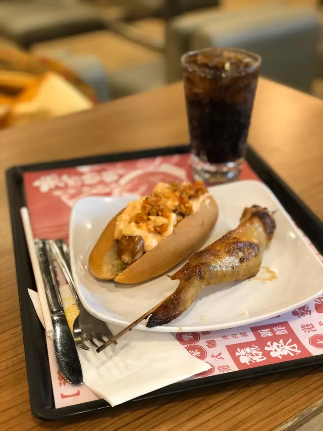 點了一個熱狗茶餐,除了熱狗,還有楓樹糖雞翼和飲品(我選了可樂)。