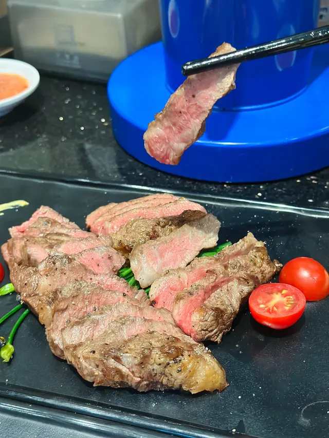 牛小排得厚薄剛好,炭烤後彈性十足,汁水滴在盤子上,擠點檸檬汁,鮮甜直衝舌尖 。