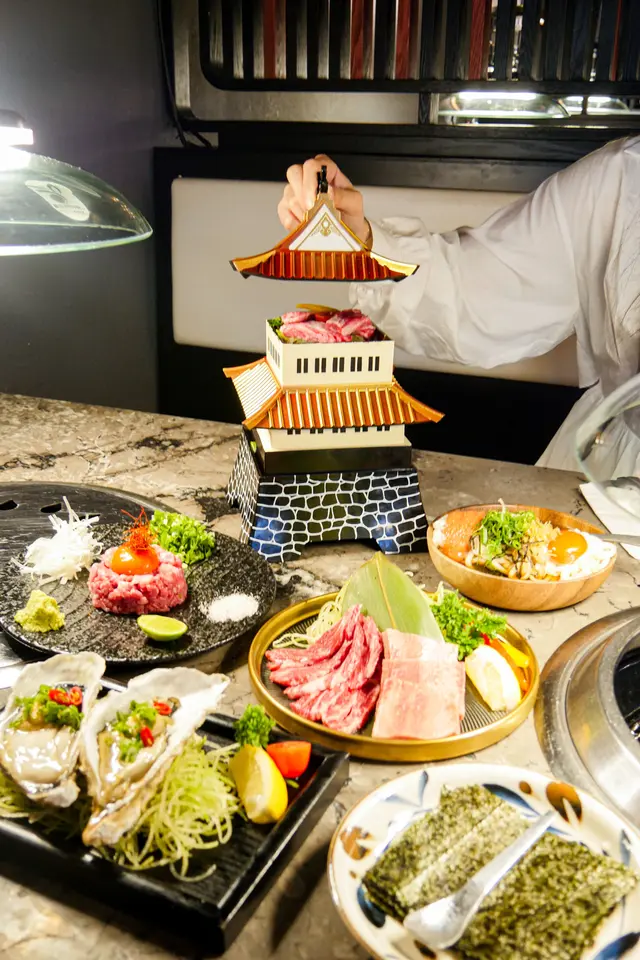 // 用咗大阪城裝有和牛金磚塊、牛三角和牛五花🥩!影相好靚好有綽頭😆仲有厚切牛舌同埋牛小排🥢