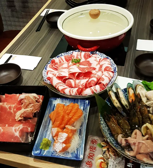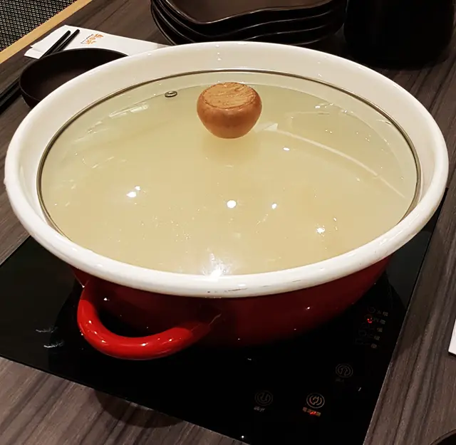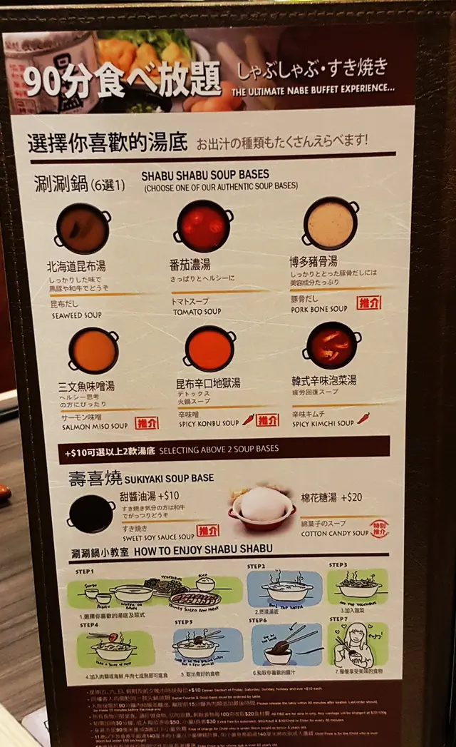 由於先前在門外已經細心研究過餐牌,所以入座後,亦二話不說,立即選了這款極上澳洲和牛 ($378)。至於湯底方面,口味豐富,合共七款,除了有傳統的北海道昆布湯、番茄濃湯外,還有三文魚味噌湯、昆布辛口地獄湯、韓式辛味泡菜湯、壽喜燒甜醬油湯及我和家人揀的博多豬骨湯