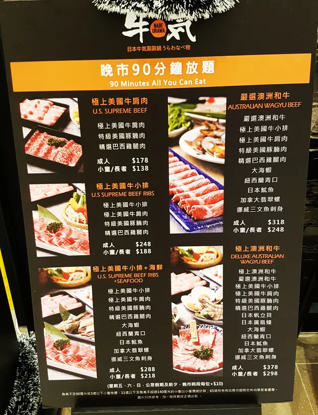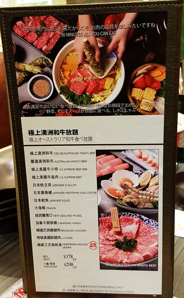 到步後,先跓足細看放在門外的餐牌,晚市 90 分鐘放題,價錢和去年旺角店比較,變動不大,由最平 $178 到 $378 不等。最基本的 $178 提供極上美國牛肩肉、精選巴西雞腿肉、特級美國豚腩肉;而最貴的 $378 就可以品嘗到澳洲和牛、美國牛小排、牛肩肉、美國豚腩肉、巴西雞腿肉、各種海鮮,包括帆立貝、廣島蠔、大海蝦、紐西蘭青口、日本魷魚、加拿大翡翠螺及三文魚刺身。等齊人後,就立即入座。