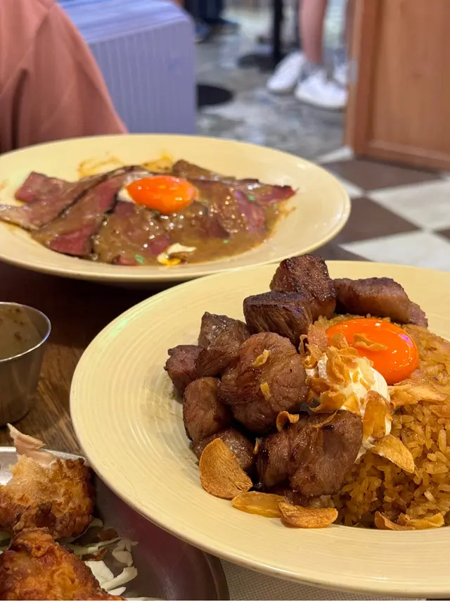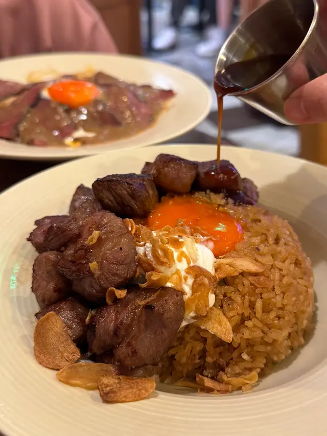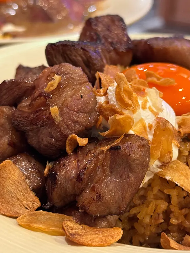 鋪滿整碗牛肉,配上用蒜香醬油炒過嘅泰國絲苗米🍚再加返日本蘭王蛋、脆蒜片,賣相已經滿分💯!牛肉份量超足,每塊都系滿滿和牛香味。蛋黃汁包住每粒飯粒,口感creamy又香滑。脆香蒜片提鮮一流,紅酒照燒汁帶微甜,口感香濃得嚟層次分明~ 🎯
