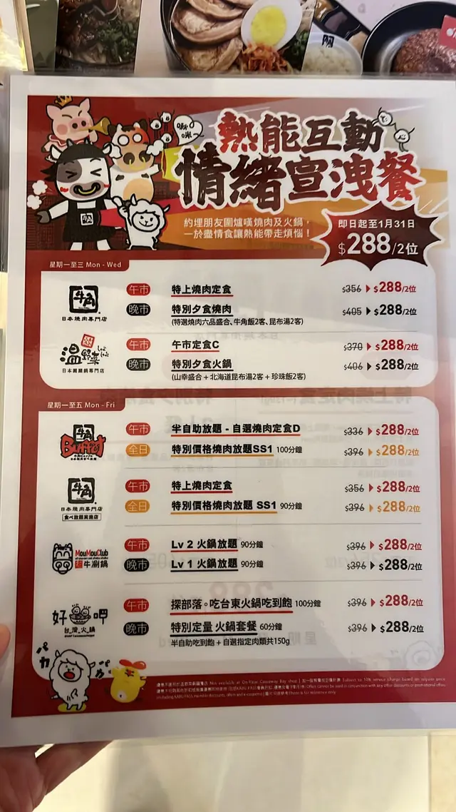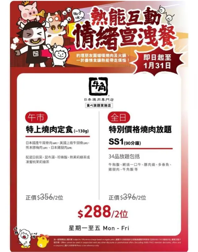 特別價格燒肉放題SS1 $288/2位,另需原價加一。