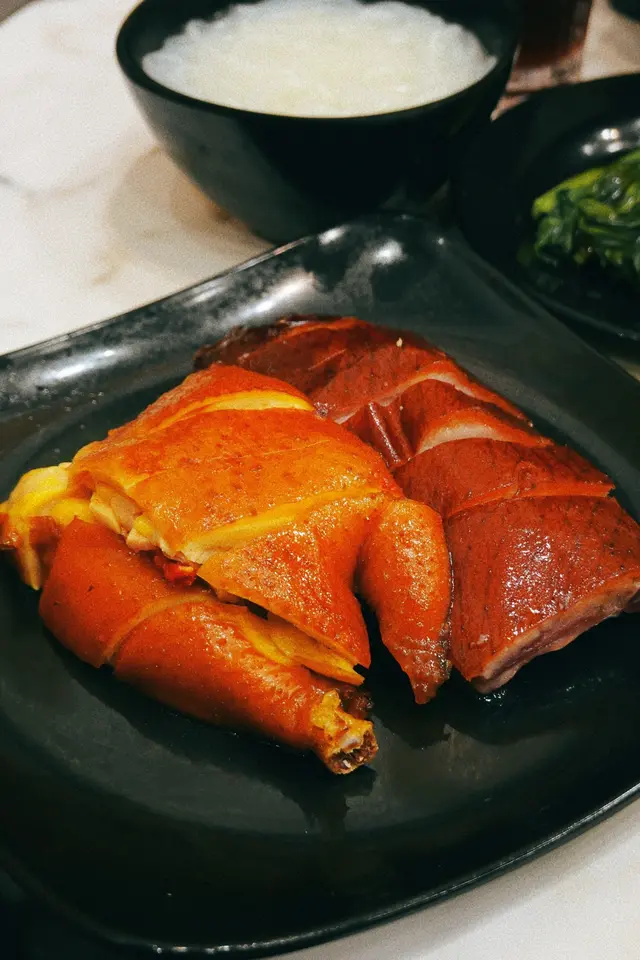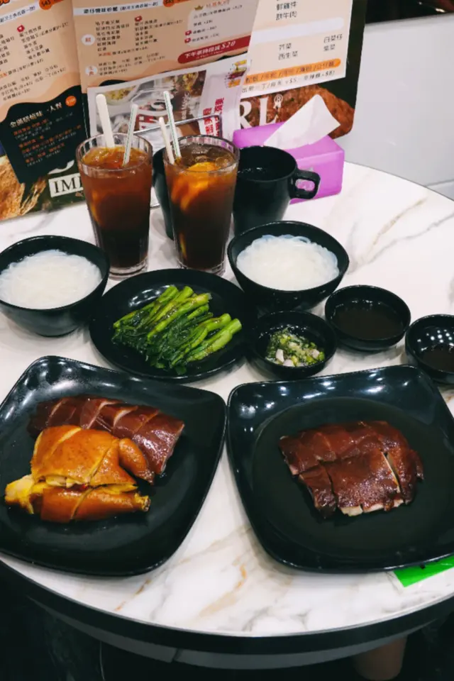 包括有乳豬例牌、燒味雙拼細例牌(我揀了油雞和燒鵝)、蠔油時蔬一碟、兩碗粉麵(我揀了瀨粉),另外奉送例湯和飲品!
