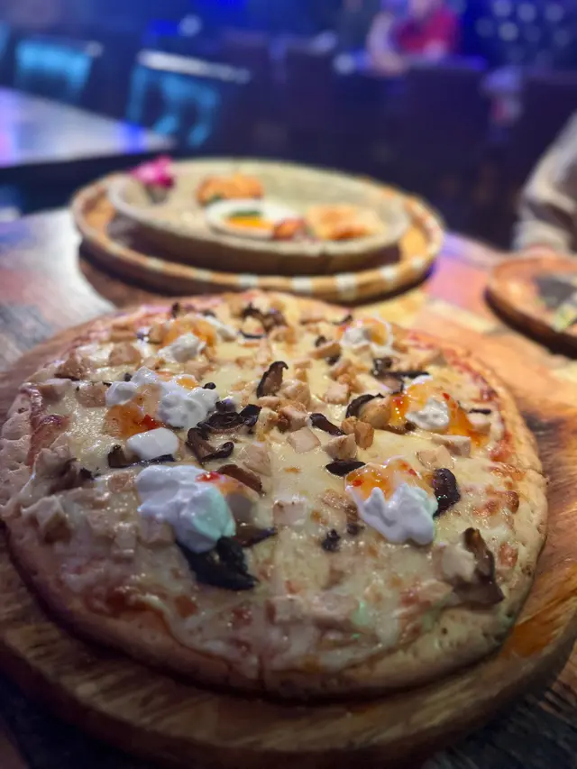 很多雞肉和番茄醬,有酸奶油上淋上甜辣醬在pizza上,很美味😋餅底脆口。