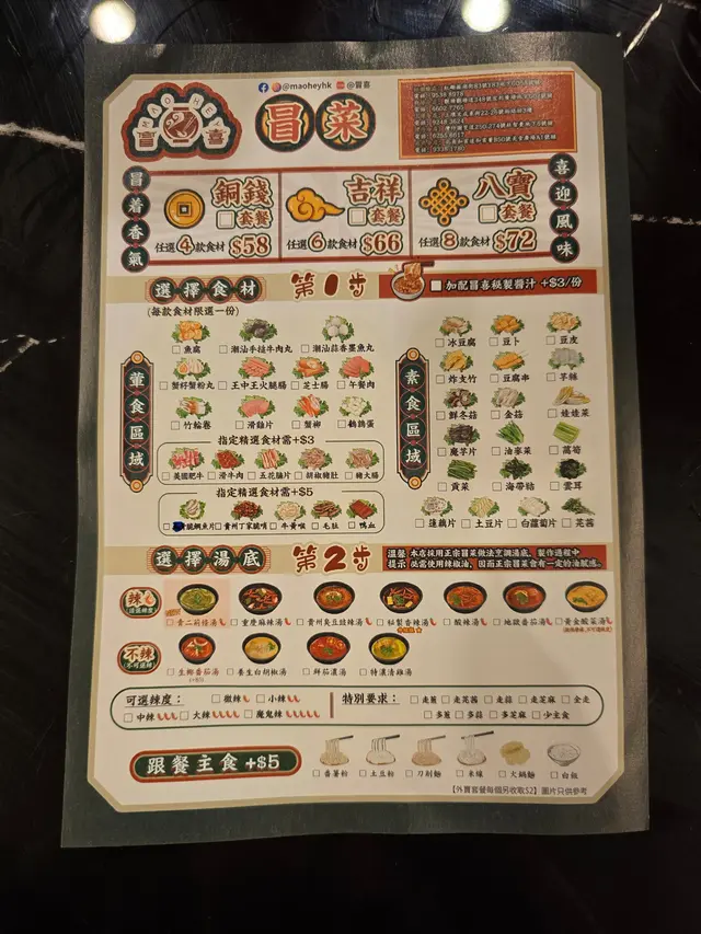 菜式包括了魚腐、潮州蒜香墨魚丸、鵪鶉蛋、滑牛肉、豬大腸、 脆哨、牛黃喉同白蘿蔔片。各款配料都幾有特色