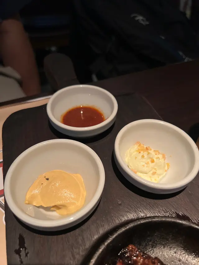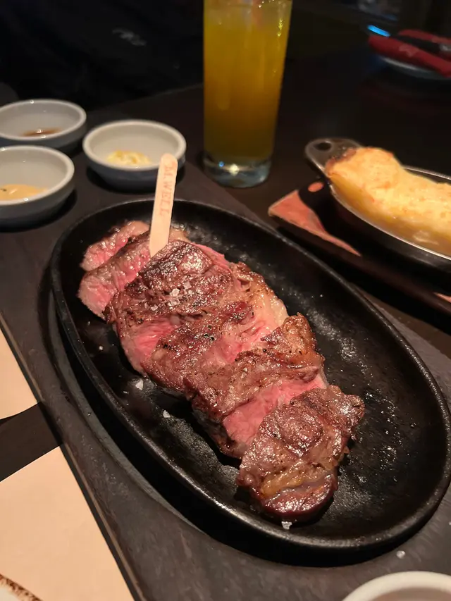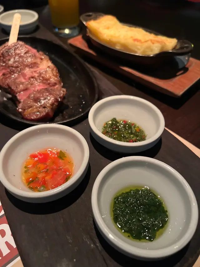 呢塊牛無論肉質定係烹調技術都好好,我地揀左7成熟,煎到外層熟,裡面仍然帶點粉紅色,鎖住肉汁,仲有6款唔同既醬點牛扒食,我覺得原味唔洗點醬,加少少鹽就最好食🥩