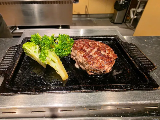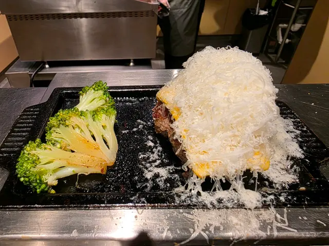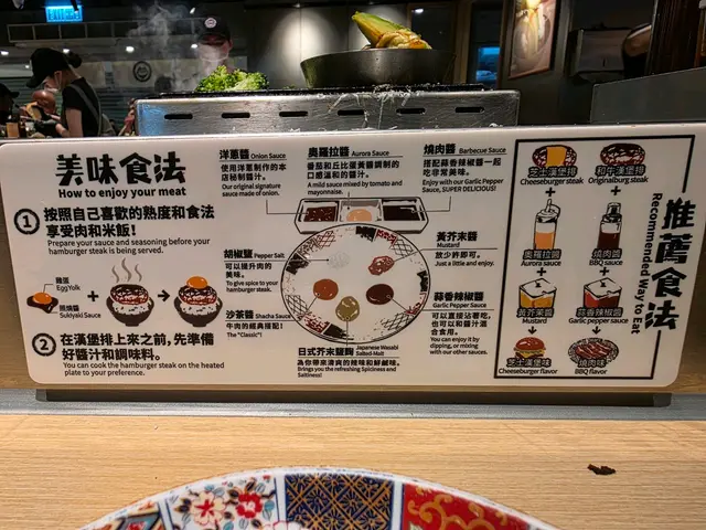 好快就上第一件漢堡扒,店員會將漢堡扒煎完之後放到顧客前面的鐵板,鐵板細細塊,上面還有三粒西蘭花伴隨,而西蘭花都係任添,西蘭花幾香,幾好食,我都添加左幾次。漢堡扒就因應自己喜歡生或熟去烹調。我覺得原味和牛漢堡扒最適合搭配多款唔同嘅醬汁食用,建議跟教學嘅醬料配撘,味道更豐富惹味。