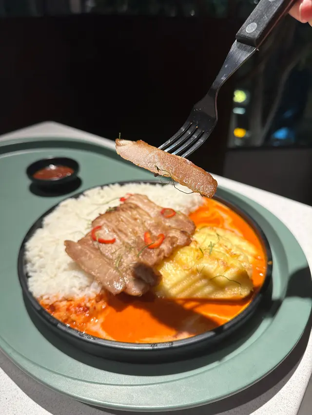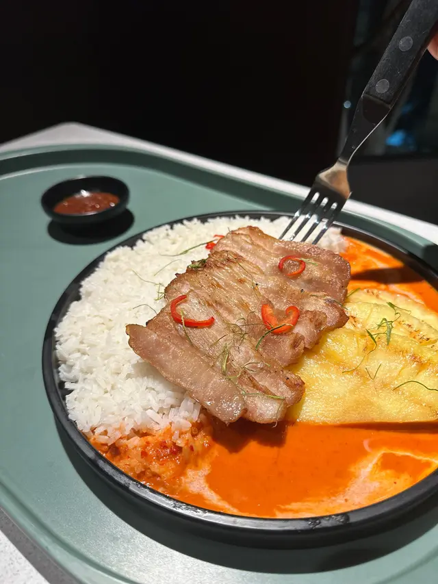 薄切+慢烤無激素同無抗生素豬肩肉好香,口感幾爽,咬落有微微肉汁滲出。裡面以泰國香草、香料、象島蝦醬調味,配搭泰國Sri Trat 直送紅咖喱,非常有泰國風味🇹🇭,整個紅咖喱好辣好開胃