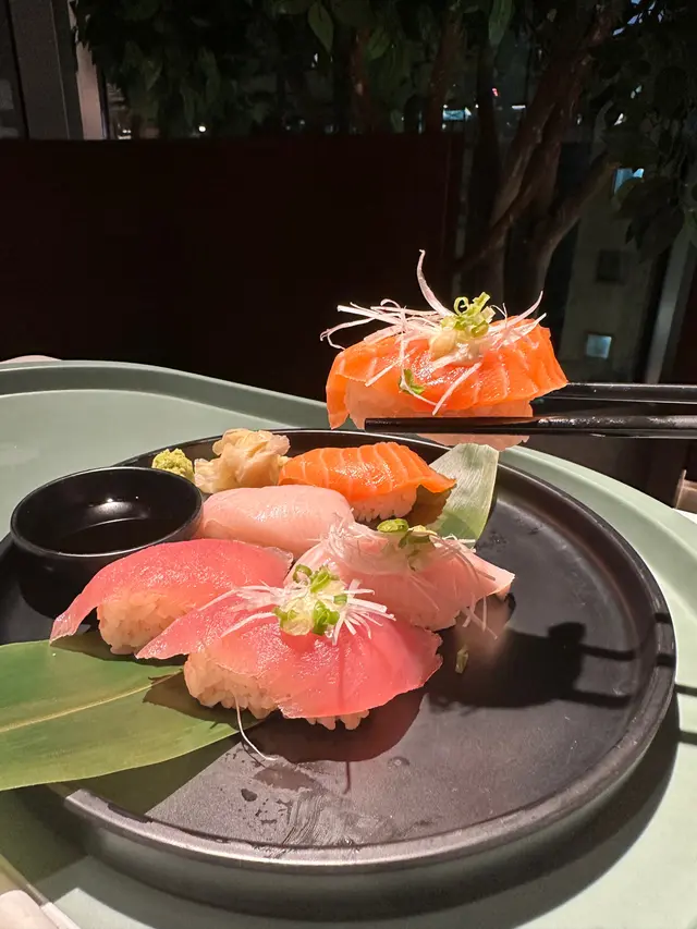 一碟6件有3款魚生:帝皇三文魚、油甘魚及海釣黃鰭吞拿魚,一半以香蔥同沙律醬點綴,令每件壽司都不一樣