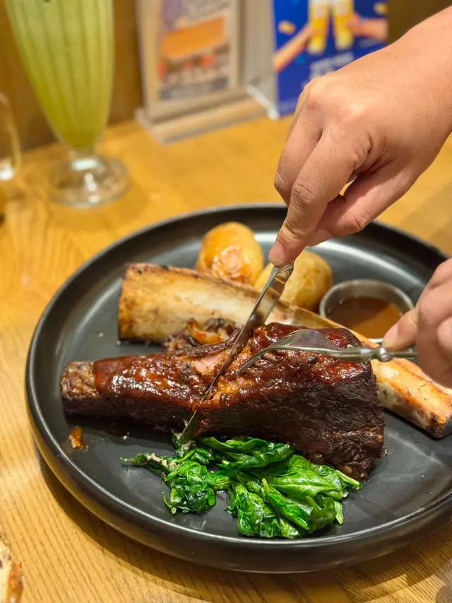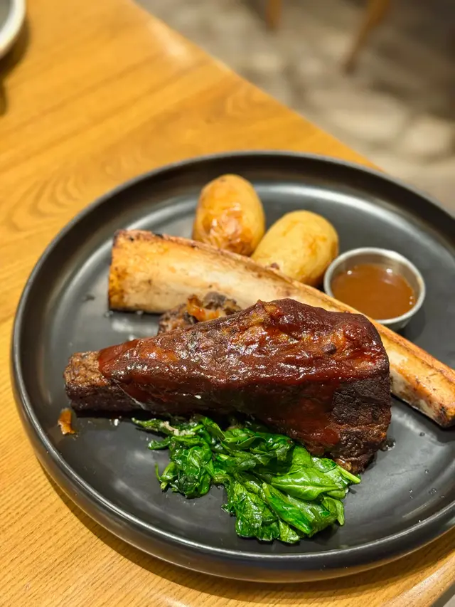 牛肋骨已起骨,更將肉與筋膜部份分開,非常貼心;牛肋肉煮至嫩滑緊緻帶不俗的肉香,醬汁輕甜開胃,蘸上燒汁令味道更添層次;烤薯外酥內糯帶濃郁薯香、菠菜翠綠鮮嫩